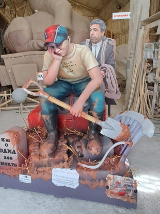 El ninot recrea a un hombre “cansado de quitar barro con una pala mientras descansa sobre el capó de un coche roto” por las inundaciones y sitúa detrás a un Mazón “que no sabe dónde ir”, ha explicado a Europa Press el autor de la escena, Ximo Esteve. El artista ha recalcado que no ha “insultado” a nadie y que su intención era mostrar que el expresidente “no estaba donde tocaba” el 29 de octubre de 2024 y que “los políticos llegaron tarde”.