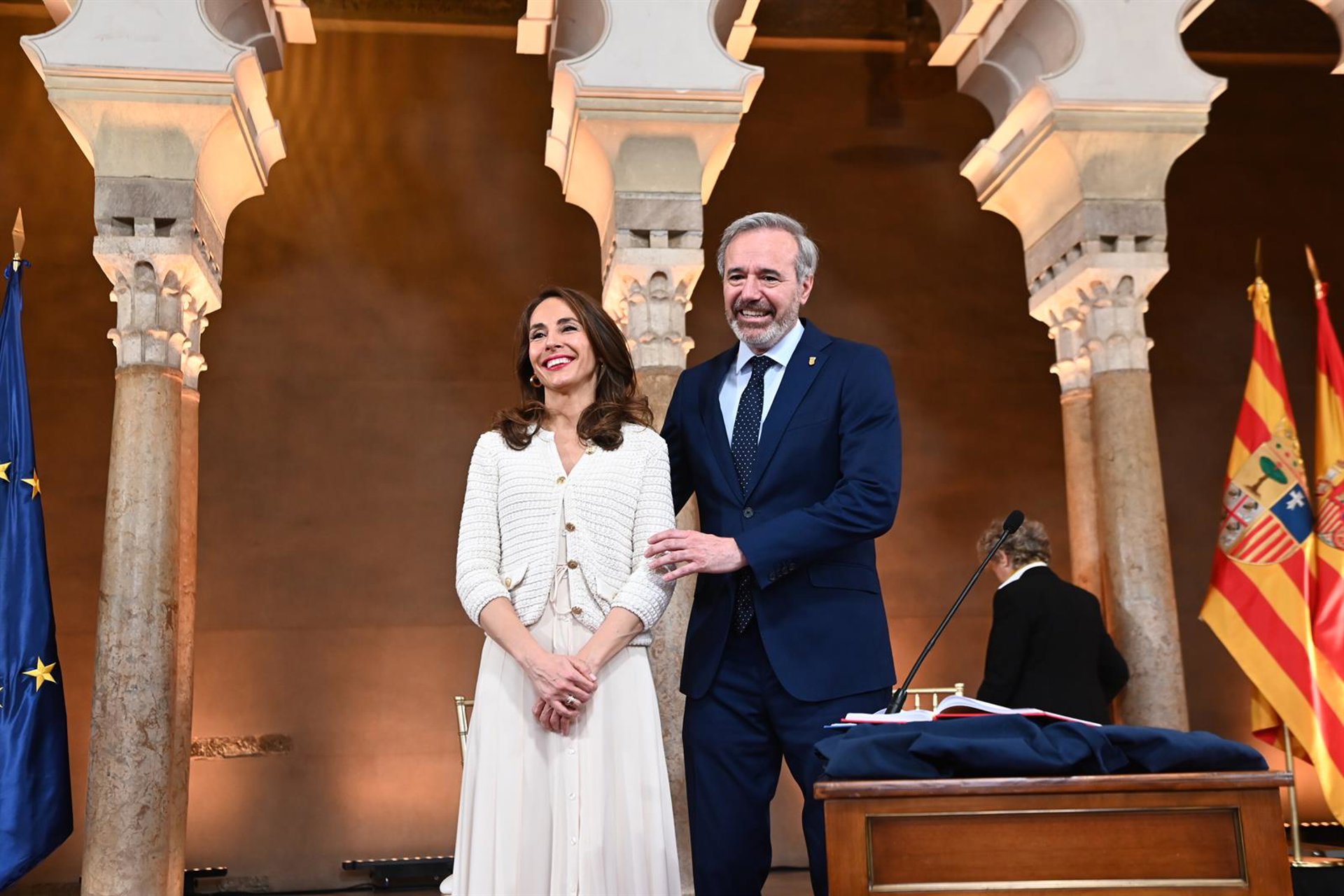 El presidente del Gobierno de Aragón, Jorge Azcón y la presidenta de las Cortes de Aragón, María Navarro, durante la toma de posesión del cargo de Azcón como presidente del Gobierno de Aragón. Ramón Comet - Europa Press