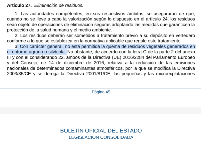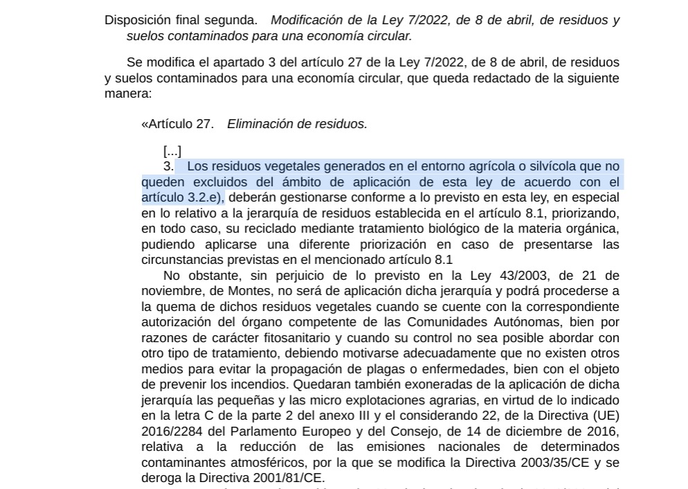 También planteaba modificar el artículo 27.3 de la Ley de residuos y suelos contaminados para una economía circular, ajustando el tratamiento de los residuos vegetales al criterio general previsto para el conjunto de residuos.