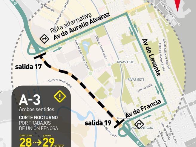 El Ayuntamiento de Rivas-Vaciamadrid ha informado de que la circulación de vehículos en la autovía A-3 (Madrid-Valencia) quedará suspendida en ambos sentidos entre los puntos kilométricos 17 y 19, desde las 22,00 horas de este miércoles y hasta las 6,00 horas del jueves.