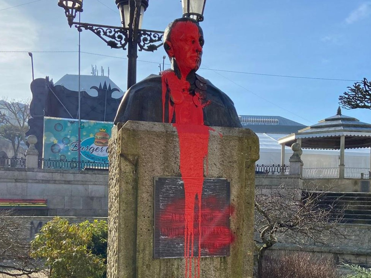 Busto de Manuel Fraga vandalizado en Vilalba (Lugo), a 22 de febrero de 2026. PP DE VILALBA