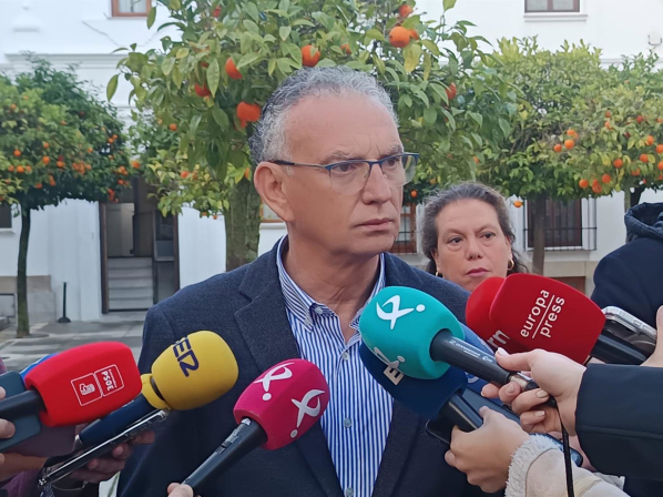 El presidente de la gestora del PSOE de Extremadura, José Luis Quintana, atiende a los medios de comunicación en el exterior de la Asamblea de Extremadura. PSOE EXTREMADURA