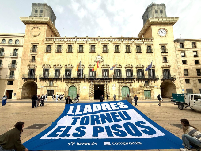 Las juventudes de Compromís (Joves PV) han llevado a cabo este martes una protesta en la plaza del Ayuntamiento de Alicante, donde han extendido una pancarta de grandes dimensiones con el mensaje “Ladrones, devolved los pisos”, escrito en valenciano. La acción se enmarca en la controversia por las viviendas de protección pública (VPP) vinculadas al residencial Les Naus, en la Playa de San Juan, y denuncia las “presuntas irregularidades” en su adjudicación.