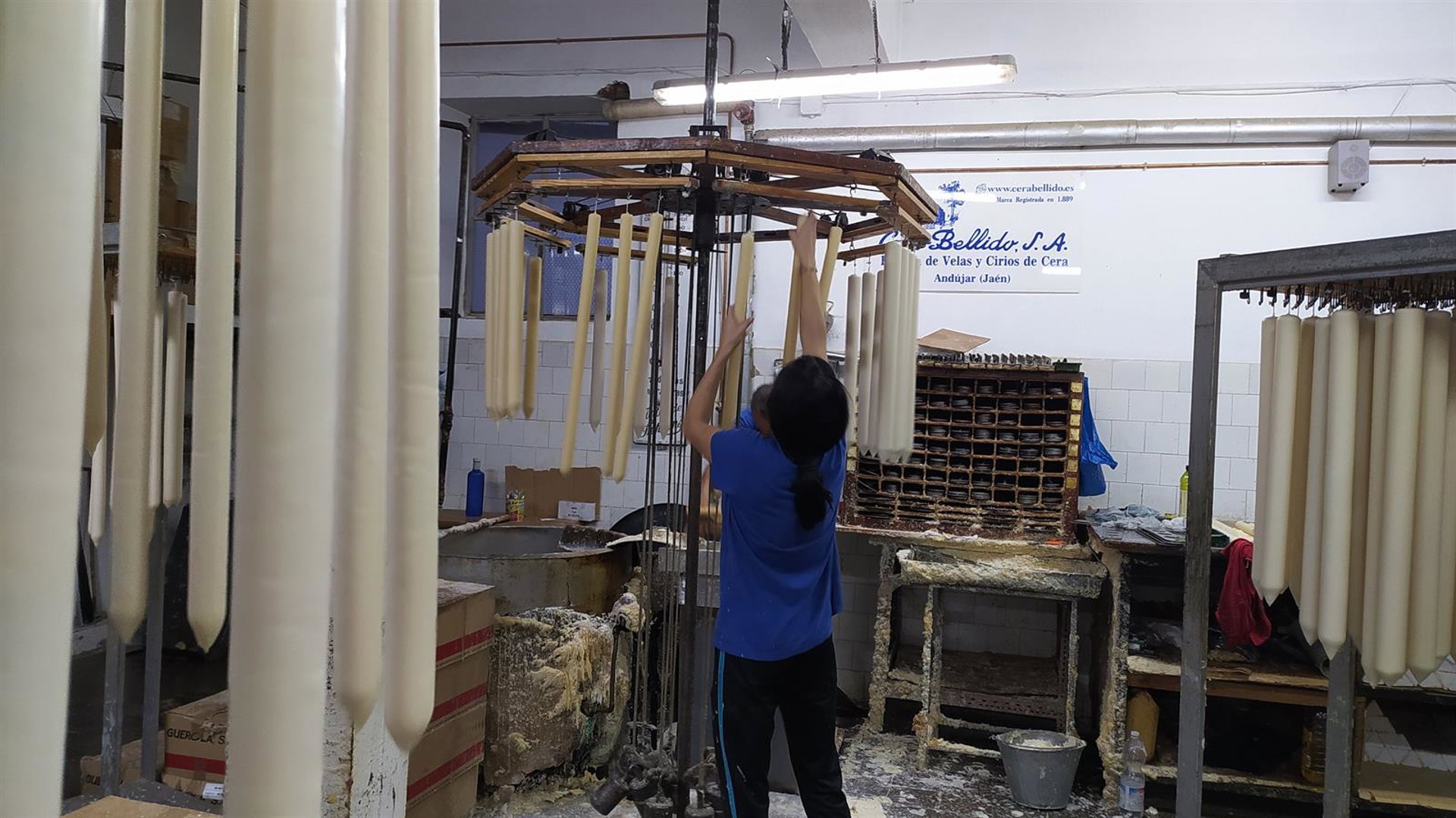 Una trabajadora de Cera Bellido cuelga cirios. CERA BELLIDO