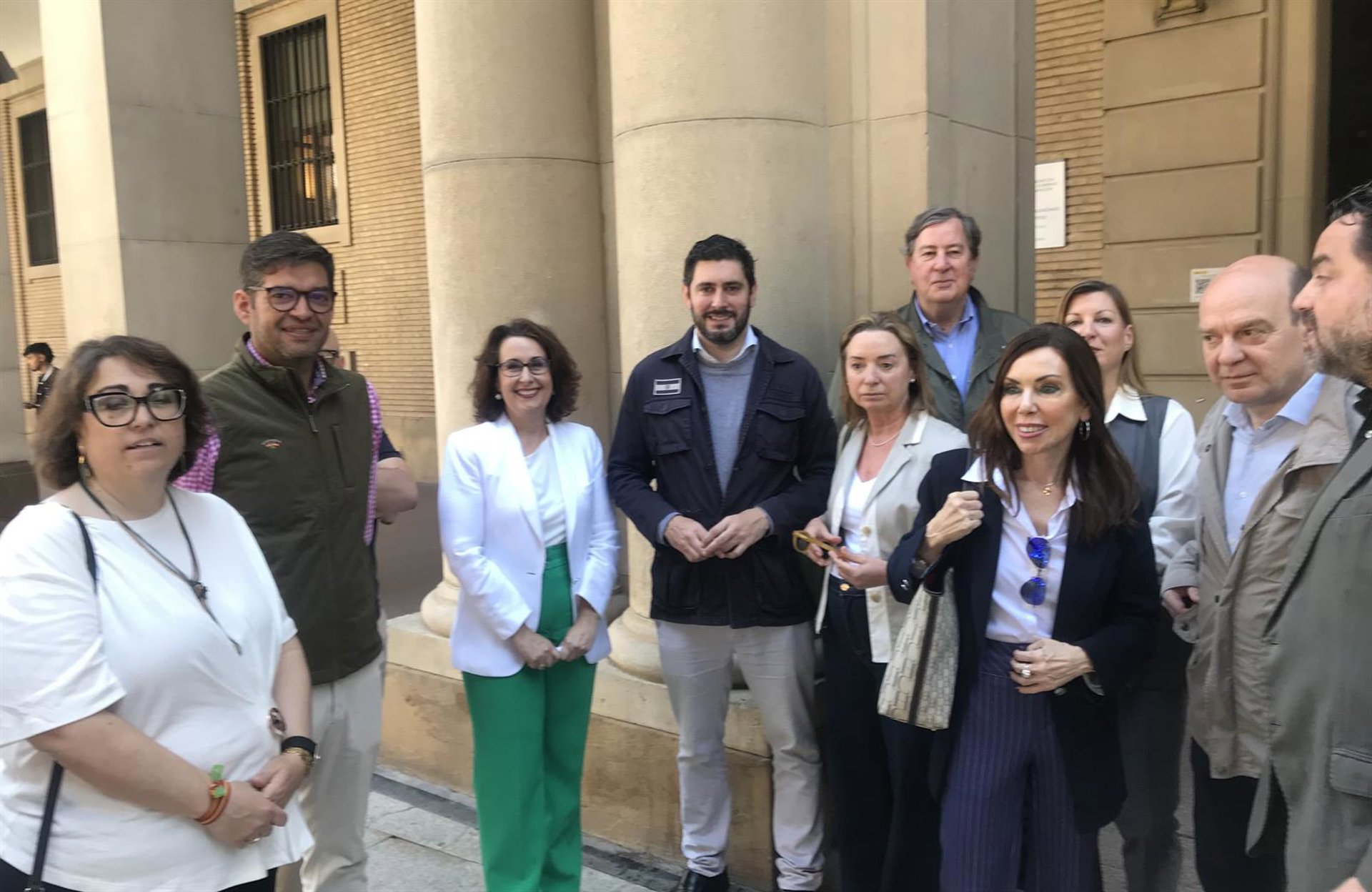 El portavoz del grupo parlamentario de VOX en las Cortes de Aragón, Alejandro Nolasco, la portavoz del grupo municipal de Vox en el Ayuntamiento de Zaragoza, Eva Torres --de blanco y verde-- y otros cargos de este partido EUROPA PRESS
