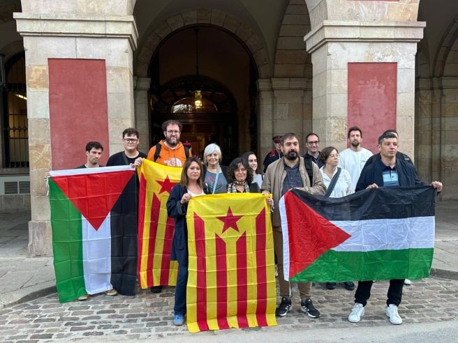 Apenas unos minutos más allá de las 9.00 horas de este miércoles, varios integrantes del partido acompañaron a Castillejo hasta la entrada del Parlament mientras entonaban consignas como ‘Desde el río hasta el mar, Palestina vencerá’, para luego posar en una foto con ‘esteladas’ y banderas palestinas.