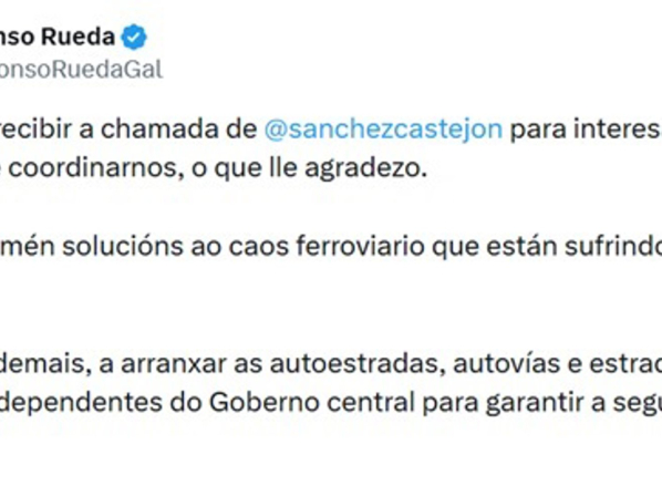 En esa publicación, tras agradecer expresamente la llamada, detalla que ha solicitado al presidente del Gobierno “soluciones al caos ferroviarios que sufren los gallegos”.