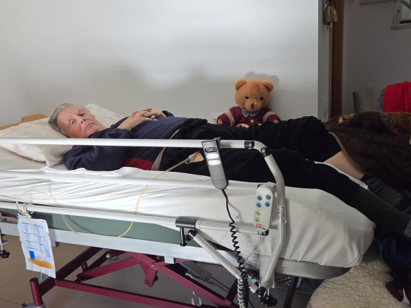 El hombre permanece encamado, sin poder caminar ni levantarse por sí mismo, y necesita cama articulada y grúa para cualquier movimiento. Desde hace seis años disponen de un servicio municipal de ayuda a domicilio durante varias horas al día, aunque es ella quien asume la mayor parte de la atención diaria, incluida la higiene, la alimentación y la administración de la medicación.