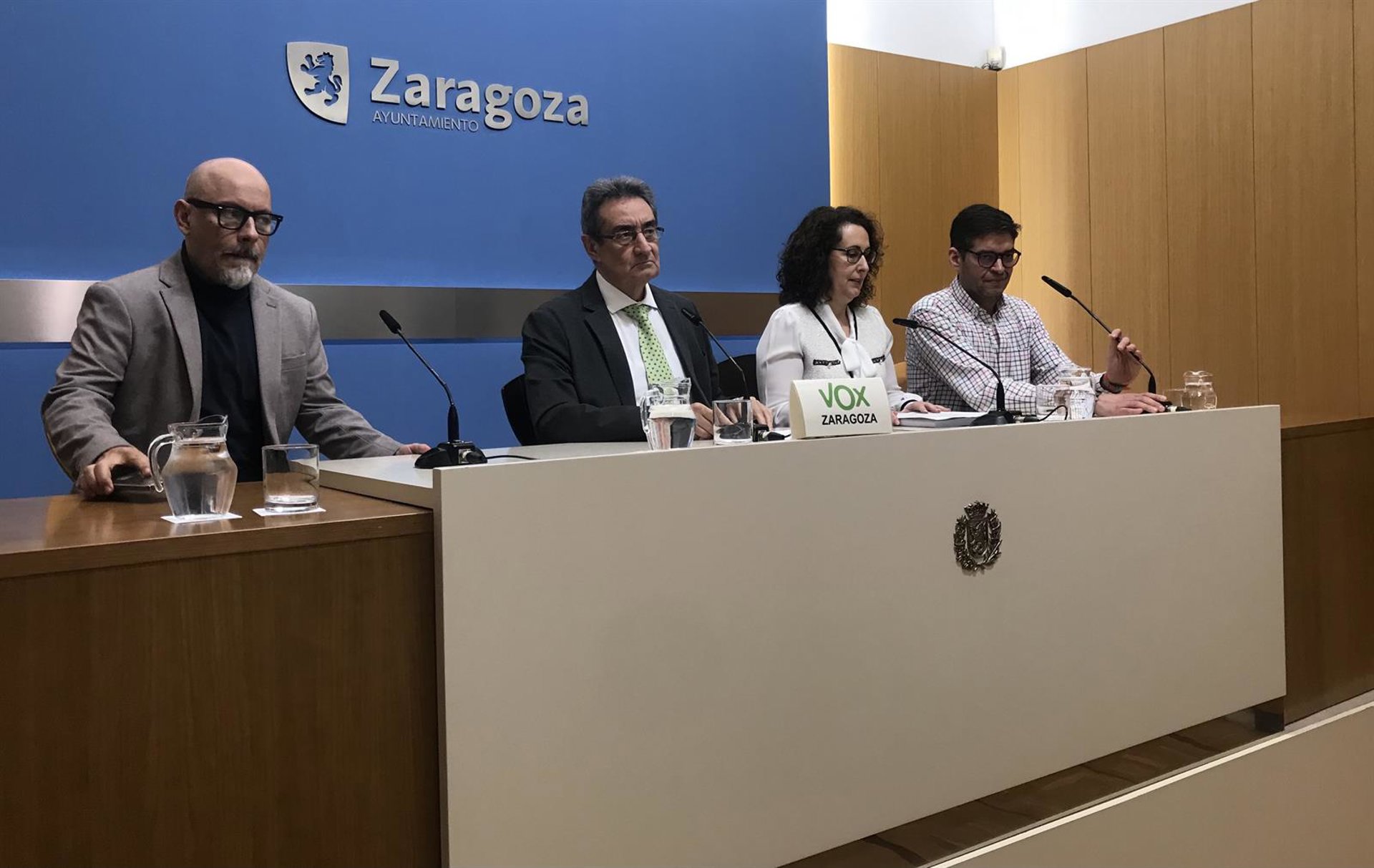 El portavoz del grupo municipal de Vox en el Ayuntamiento de Zaragoza, Julio Calvo --segundo por la izquierda-- con el resto de concejales de Vox EUROPA PRESS