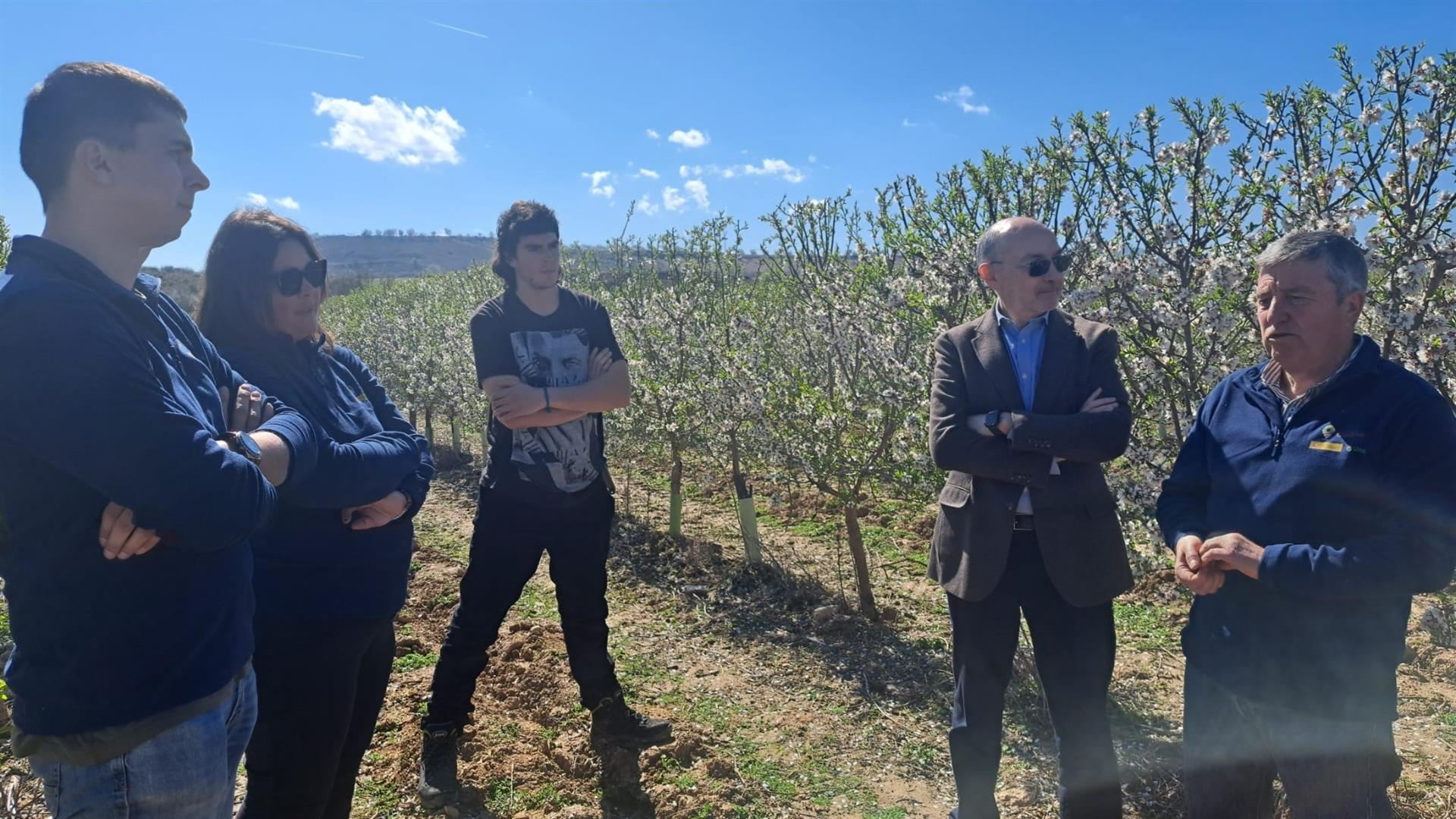 En la visita, el delegado ha estado acompañado por el secretario general de UPA Aragón, José Manuel Roche, y por el propietario de la explotación familiar Aljemi, especializada en almendros y olivos, Juan Pablo Bellido. También han asistido los tres alumnos que participan esta semana: Alberto Gimeno Lisbona, de Aniñón y titular de una explotación de cereal con algunas parcelas de olivo y almendro; Leticia García Garín, de Fuentes de Ebro, con una explotación de almendros en regadío; y Javier Calzada Pañero, de Cáceres, que gestiona una explotación de pinos resineros y olivos en la que está empezando a introducir frutales y almendros.