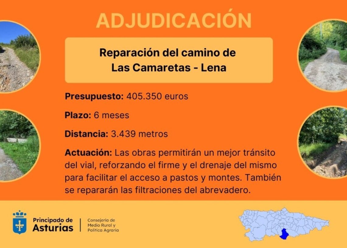 La Consejería de Medio Rural y Política Agraria ha adjudicado por un importe de 405.350 euros las obras de reparación del camino de Las Camaretas, situado en la localidad de Ronzón, dentro del concejo de Lena. La empresa Contratas Souto, S.L. será la responsable de ejecutar estos trabajos, para los que se ha fijado un plazo máximo de seis meses.