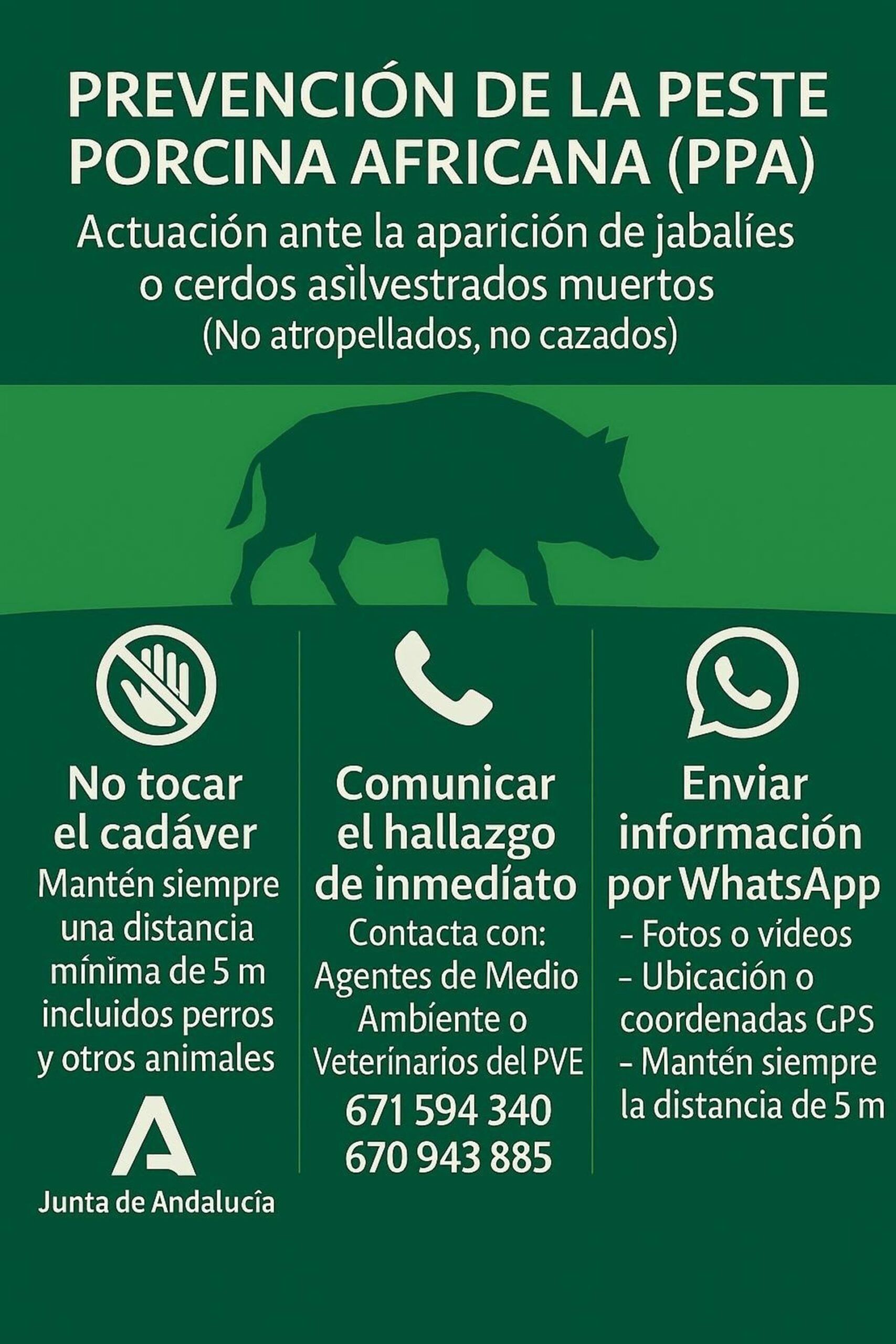 En caso de atropellar a un jabalí o localizarlo muerto, la indicación es “no acercarse, no tocarlo y avisar de inmediato a la Policía Local o al 112 Andalucía”, mientras que, por su parte, los cazadores deben “extremar la bioseguridad en la manipulación de las piezas, ya que cualquier descuido puede actuar como vehículo involuntario de transmisión”.