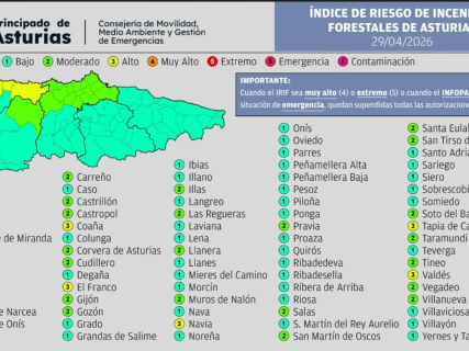 El Principado de Asturias encarará este miércoles, 29 de abril, una jornada con peligro de incendios forestales condicionado por una situación meteorológica estable, pero con áreas de especial atención en la franja costera del occidente. De acuerdo con los datos difundidos por el Indurot, serán 6 los concejos que se sitúen en riesgo alto (índice 3), mientras que 21 municipios permanecerán en nivel de riesgo moderado (índice 2) y los otros 51 continuarán en riesgo bajo (índice 1). Estas estimaciones se han elaborado tomando como referencia las previsiones de la AEMET y la recurrencia histórica de incendios en la comunidad.