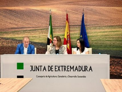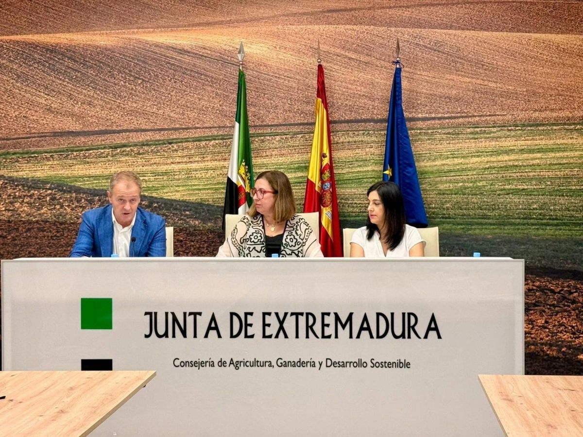 Mercedes Morán, consejera de Agricultura, Ganadería y Desarrollo Sostenible, junto con Ramón Sanguino, director de la Cátedra de Economía Social y Cooperativismo de la UEx, y otros representantes, presentaron el evento en Mérida, destacando su importancia estratégica para el desarrollo regional.