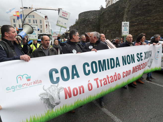 Agricultores y ganaderos de Galicia protagonizaron este lunes nuevas protestas en la comunidad, con concentraciones en A Coruña y Lugo —en esta última con una nutrida presencia de tractores— para mostrar su rechazo al acuerdo de libre comercio entre la Unión Europea y Mercosur y reclamar un "comercio justo" para el sector.