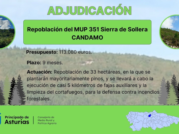 La Consejería de Medio Rural y Política Agraria ha contratado por 113.080 euros la repoblación forestal del monte de utilidad pública Sierra de Sollera, en el concejo de Candamo. La empresa adjudicataria, Forestal Malleza, dispone de un plazo de nueve meses para desarrollar las actuaciones previstas.
