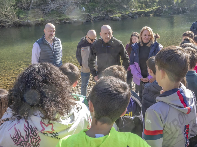 Escolares de Cuevas del Castillo ayudan a liberar 4.000 alevines de trucha en el Pas en una jornada de educación ambiental y repoblación fluvial.