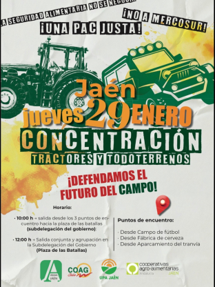 Las organizaciones agrarias Asaja, UPA, COAG y Cooperativas Agro-Alimentarias han convocado concentraciones y cortes en distintos puntos del territorio nacional. En la capital jiennense, la protesta principal está fijada a las 12.00 horas frente a la Subdelegación del Gobierno, en la plaza de las Batallas.