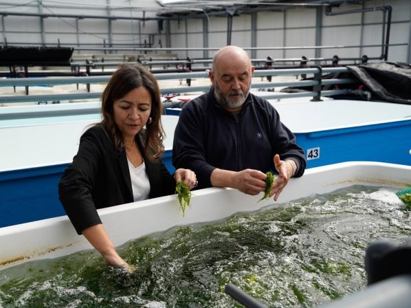 En el recorrido por las instalaciones, Villaverde tuvo ocasión de profundizar en las características del proyecto pionero de cultivo de erizo y algas marinas en tierra, que se desarrolla a través de su planta experimental.