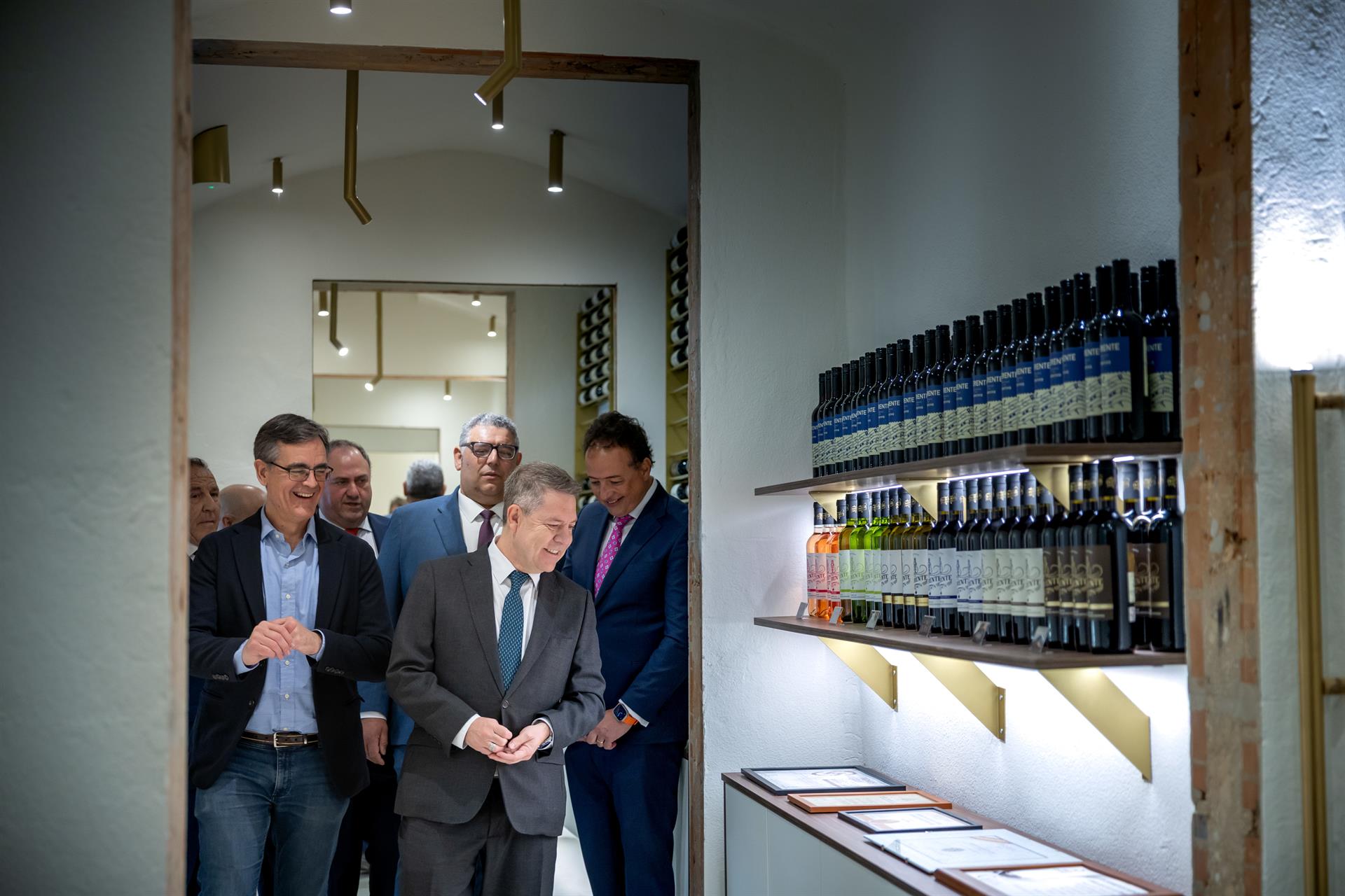 El consejero de Agricultura, Ganadería y Desarrollo Rural, Julián Martínez Lizán, acompañado por el presidente de Castilla-La Mancha, Emiliano García-Page, ha recorrido las instalaciones de esta cooperativa vitivinícola.