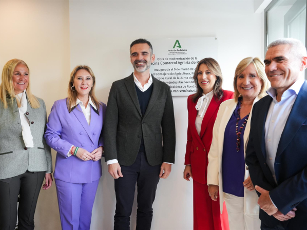 El consejero de Agricultura, Pesca, Agua y Desarrollo Rural, Ramón Fernández-Pacheco, y la consejera de Economía, Hacienda y Fondos Europeos, Carolina España, han puesto en marcha este lunes la nueva sede de la Oficina Comarcal Agraria (OCA) de Ronda, en la provincia de Málaga, una actuación que ha requerido una inversión de 1,7 millones de euros.
