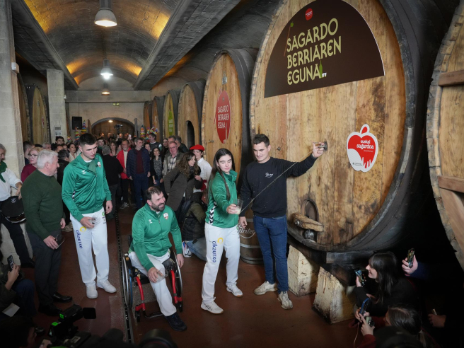 En ese instante, los representantes de la selección vasca de pelota han pronunciado el tradicional “Gure Sagardo Berria” (“Nuestra nueva sidra”), con el que se ha dado por abierta la primera 'kupela' de sidra del año.