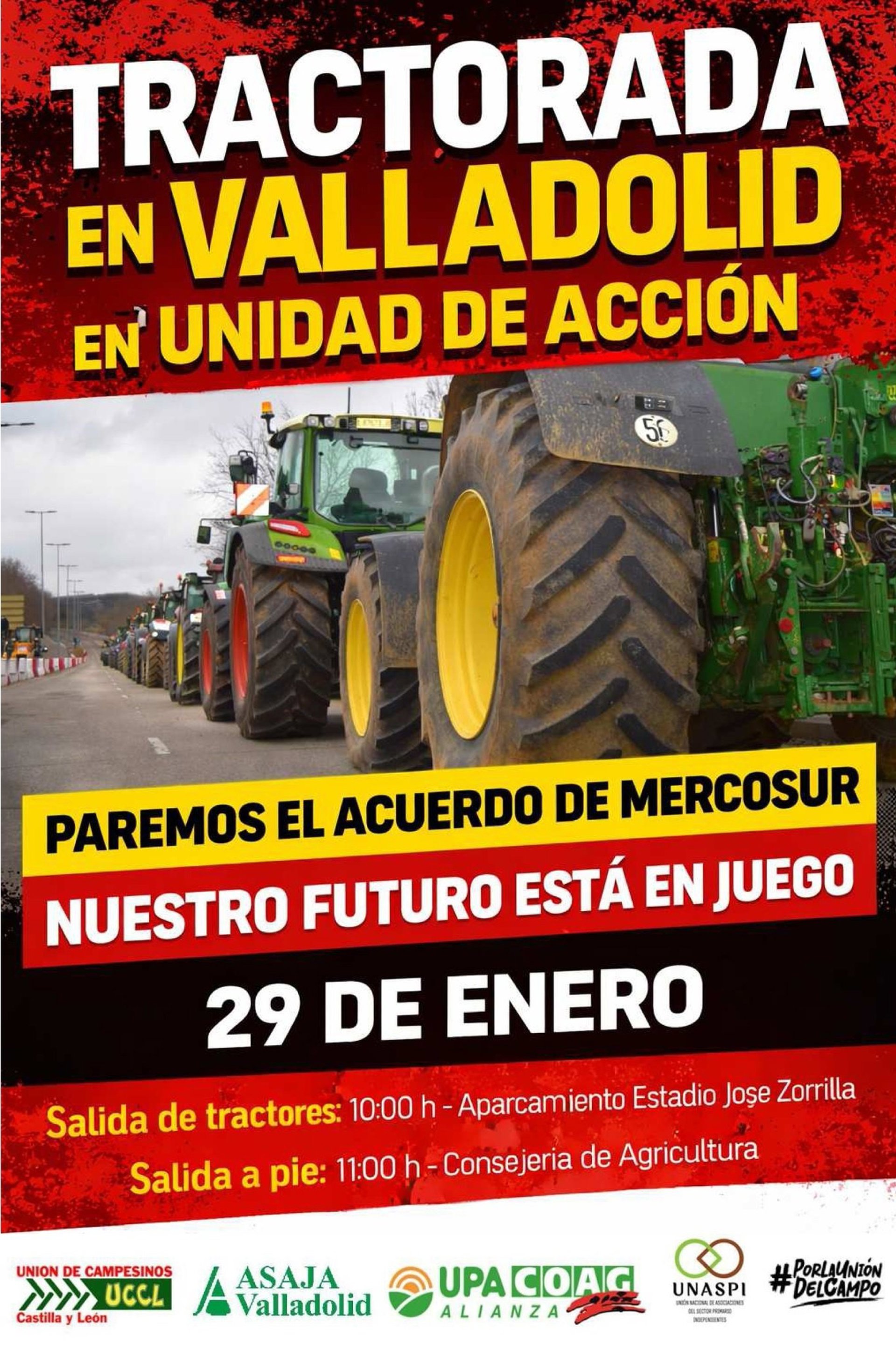 La protesta en Valladolid cuenta con el respaldo de Asaja, UPA, COAG, UCCL y la Unión Nacional de Asociaciones del Sector Primario Independientes (Unaspi), que la difunden bajo el hashtag “Por la unidad del campo” y el lema “Paremos el acuerdo de Mercosur. Nuestro futuro está en juego”.