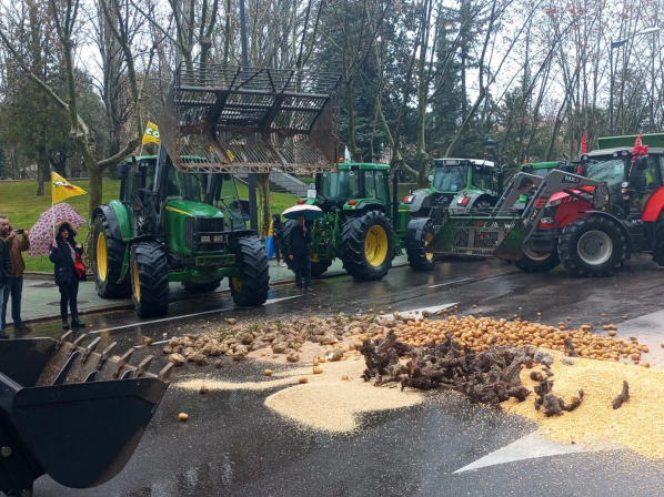 Más de 300 tractores han tomado este jueves el centro de Zamora para clamar "no al acuerdo con Mercosur" y sumarse a una movilización en la que los convocantes han esparcido en la calzada patatas, remolacha, maíz y vides, con el objetivo de visualizar de forma contundente su enfado ante el panorama que, a su juicio, se está configurando para el sector agrario.
