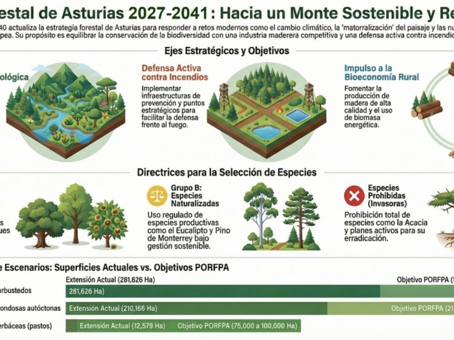 Igualmente, contempla el impulso de la ganadería extensiva regenerativa como herramienta para prevenir el fuego y recuperar los suelos; la promoción de la multifuncionalidad del monte y su papel en la mitigación del cambio climático; la garantía de un suministro sostenible de materias primas forestales; y la movilización y valorización de la biomasa forestal en el contexto de la transición energética.