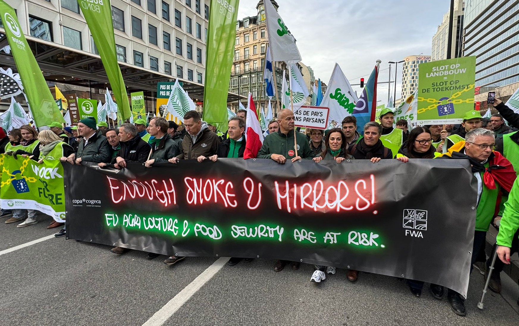 Alrededor de 10.000 agricultores de todos los estados miembro se han manifestado hoy en Bruselas coincidiendo con el Consejo Europeo que reúne a los primeros ministros de los 27 estados de la Unión. Se trata de una moviliización paneuropea, liderada por el COPA-Cogeca, entidad que agrupa a 40 organizaciones profesionales agrarias y federaciones de cooperativas de los 27 estados miembro.