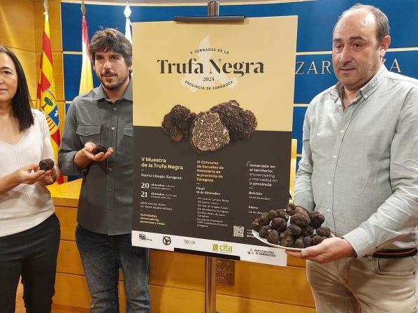 La presentación de las jornadas tuvo lugar este jueves en la DPZ, contando con la presencia de Cristina Palacín, diputada provincial; Jesús López, presidente de Truzarfa; y Pedro Marco, investigador del CITA. Este año, las actividades se centrarán en la divulgación del ‘Tuber melanosporum’, con sesiones informativas en Belchite y Zuera, seguidas del tradicional Mercado de Trufa Negra en Zaragoza.