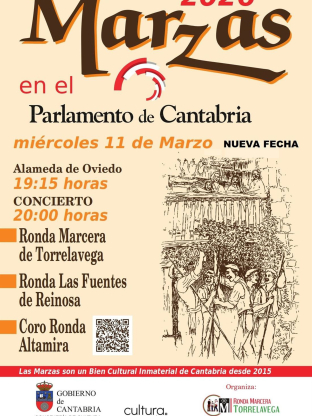 El Parlamento de Cantabria albergará este miércoles, 11 de marzo, una nueva celebración de Las Marzas 2026, en la que tomarán parte la Ronda Marcera de Torrelavega, la Ronda Las Fuentes de Reinosa y el Coro Ronda Altamira.