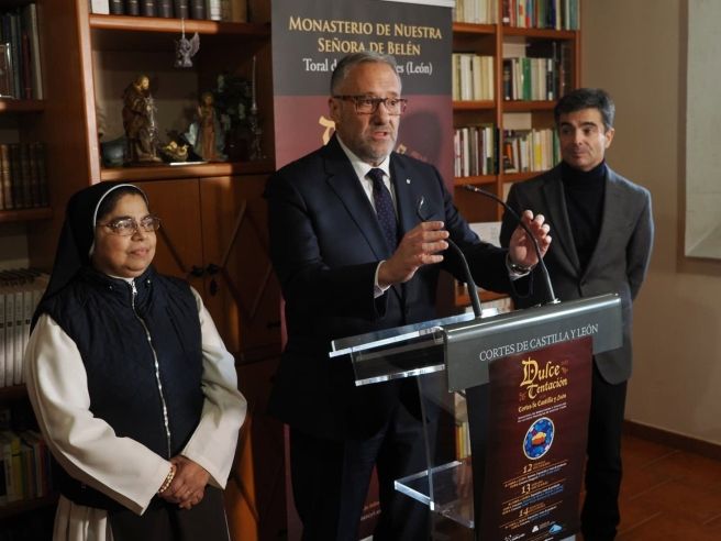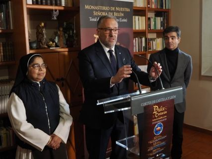 El presidente de las Cortes de Castilla y León, Carlos Pollán, y el director de la Fundación de Castilla y León, Juan Zapatero, han dado a conocer este martes, en el Monasterio de Nuestra Señora de Belén de Toral de los Guzmanes (León), una nueva edición de la feria de repostería de convento ‘Dulce Tentación’, que tendrá lugar del 12 al 14 de diciembre en la sede del Parlamento autonómico.