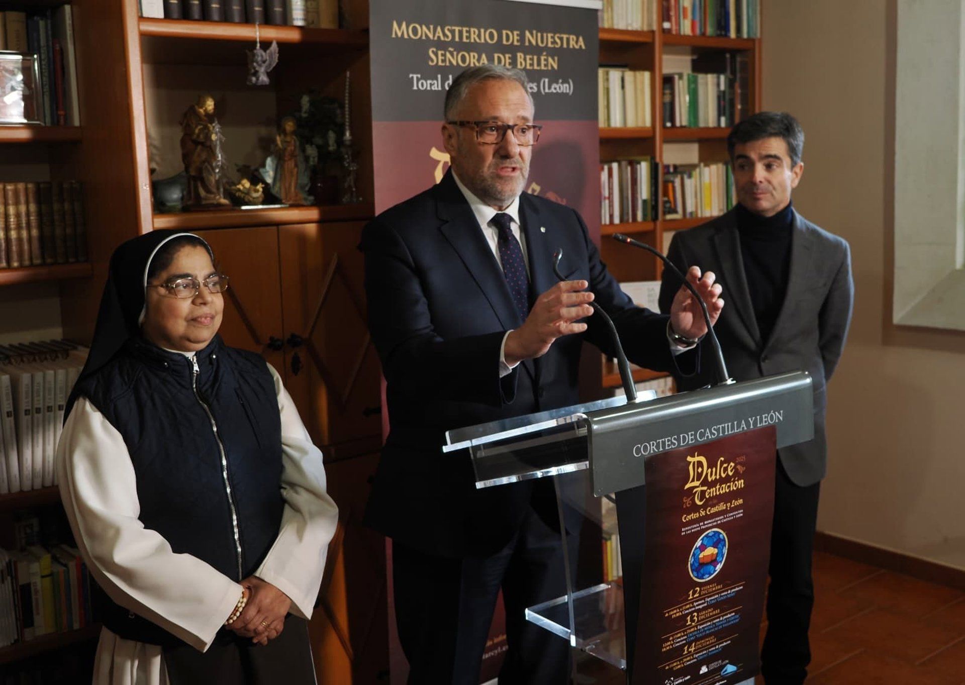 El presidente de las Cortes de Castilla y León, Carlos Pollán, y el director de la Fundación de Castilla y León, Juan Zapatero, han dado a conocer este martes, en el Monasterio de Nuestra Señora de Belén de Toral de los Guzmanes (León), una nueva edición de la feria de repostería de convento ‘Dulce Tentación’, que tendrá lugar del 12 al 14 de diciembre en la sede del Parlamento autonómico.