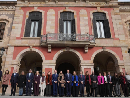 El presidente del Parlament, Josep Rull, junto a diversos consellers del Govern —entre ellos la responsable de Igualdad y Feminismo, Eva Menor—, así como integrantes de la Mesa y diputados de todos los grupos políticos, a excepción de AC, han participado este miércoles en un minuto de silencio frente a la Cámara catalana en repulsa por el asesinato de una vecina de Lleida el pasado domingo.