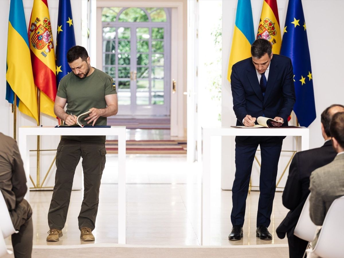 El presidente del Gobierno de España, Pedro Sánchez, y el presidente de Ucrania, Volodímir Zelenski, firmaron este lunes el ‘Acuerdo en materia de Seguridad entre España y Ucrania’, que compromete a España a brindar material militar por valor de 1.000 millones de euros durante este año y a continuar con sus aportaciones al fondo común europeo hasta 2027.