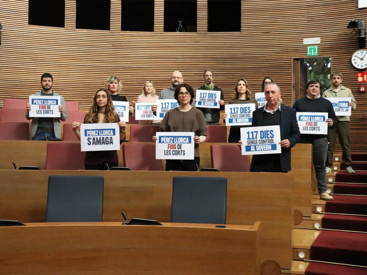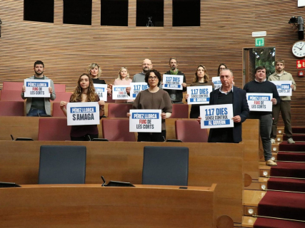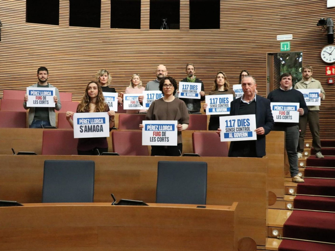 Los diputados de Compromís han escenificado su protesta con una 'performance' en el hemiciclo de Les Corts, justo antes de la reunión de la junta de síndics encargada de fijar el calendario parlamentario del nuevo periodo de sesiones, iniciado este lunes 9 de febrero. Durante la acción, los parlamentarios han exhibido carteles con lemas como “Pérez Llorca se esconde”, “Pérez Llorca huye de Les Corts”, “117 días sin control al Gobierno” o “Mazón fuera de Les Corts ya”.