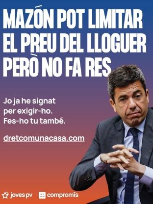 Los simpatizantes pueden unirse a través de la página web ‘dretcomunacasa.com’. Por cada adhesión, se enviará un email a Mazón con estas reivindicaciones. “Desde 2023, la Generalitat puede regular el precio del alquiler, pero Mazón no hace nada”, critica Joves PV en un comunicado.