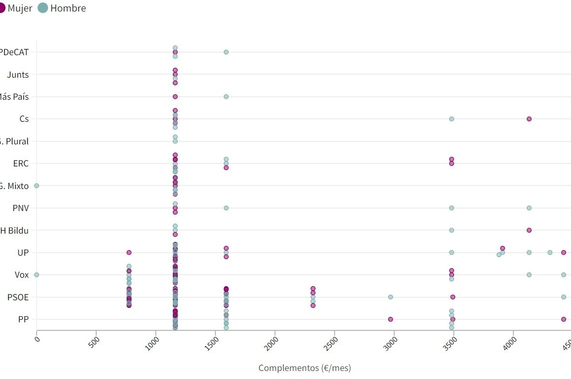 Dado que los complementos más numerosos son los de alrededor de 1.160 euros, lo que determine si existe brecha salarial (y el grado de la misma) será el acceso por sexos a los cargos en las Mesas de las cámaras, en la Junta de Portavoces y, en menor medida, a las presidencias de comisión.