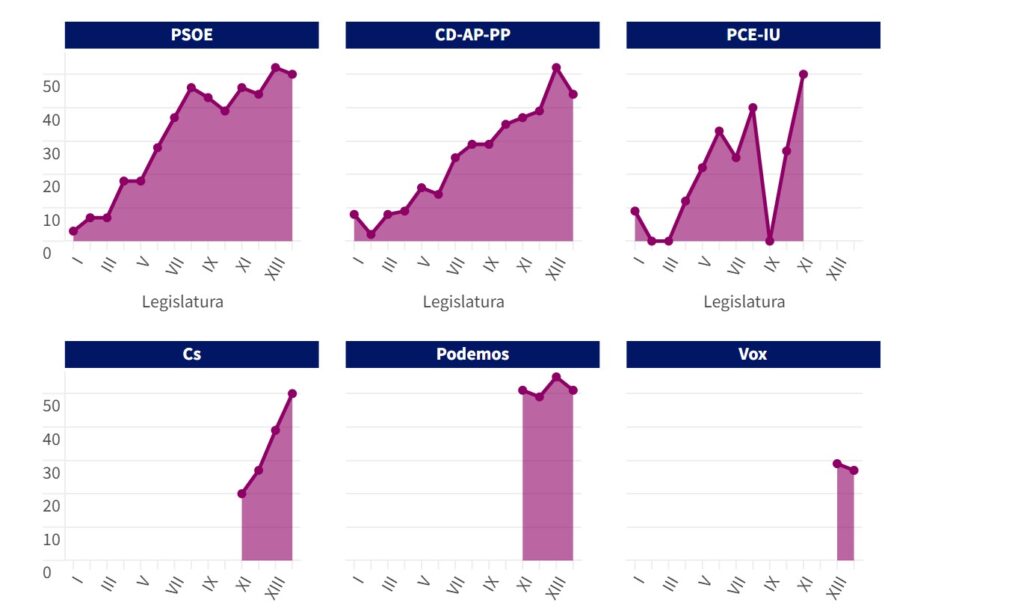 2. Se han dejado fuera también las participaciones de menos de un minuto de duración. Se tratan en su mayoría de juramentos para tomar posesión del escaño, cuestiones de orden, solicitudes de turno de palabra por alusiones, discursos de la Mesa de Edad… Suponían menos del 1% del total de intervenciones recopiladas.