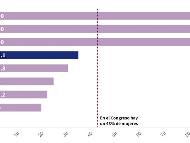 De esa forma, las probabilidades de que una diputada participe en la tramitación de un texto se reducen en leyes que pasen por comisiones como las de Defensa (donde solo tienen uno de cada cuatro asientos), Interior (27%); Agricultura y Pesca o Seguridad Vial (29%); Transición Ecológica, donde quedan encuadradas las políticas de energía (31%); Asuntos Económicos (32%), Presupuestos o Hacienda y Función Pública (35%), según los datos extraídos y analizados por Demócrata.