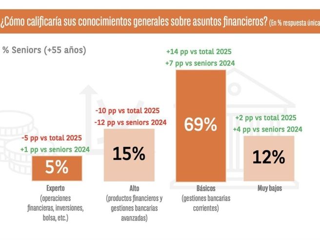 El análisis también destaca una «reducción significativa» en el porcentaje de sénior que se consideran bien informados sobre finanzas, disminuyendo del 26,4% en 2024 al 14,5% en 2025. A pesar de que se observa un ligero aumento en aquellos que se consideran expertos, del 4,6% frente al 3,6% del año anterior, también se incrementa el número de quienes admiten tener un conocimiento muy bajo, lo que señala una «polarización creciente» dentro de este grupo.