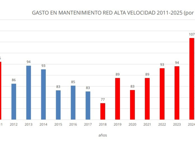 En términos unitarios por kilómetro, el mantenimiento de la alta velocidad pasa de 83.000 euros en 2017 a 110.000 euros en 2025, lo que implica un incremento aproximado del 33%.