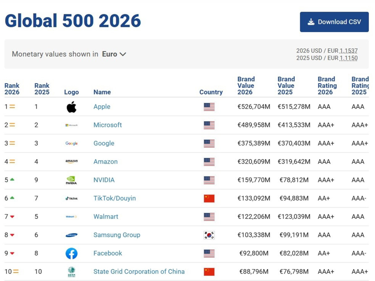 Con estos resultados, las cinco primeras plazas de la tabla continúan copadas por gigantes tecnológicos. El cuarto lugar es para Amazon, cuya marca se valora en 320.609 millones de euros (+4% interanual), mientras que el quinto puesto corresponde a la estadounidense de semiconductores Nvidia, con 159.770 millones de euros y un avance del 110%.