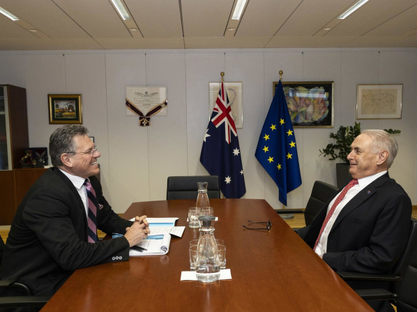 El ministro de Comercio y Turismo de Australia, Don Farrell (d) conversa con el comisario de Comercio, Maros Sefcovic, durante la ronda politica de negociación de un acuerdo de libre comercio este mes de febrero. LUKASZ KOBUS /EUROPEAN COMMISSION