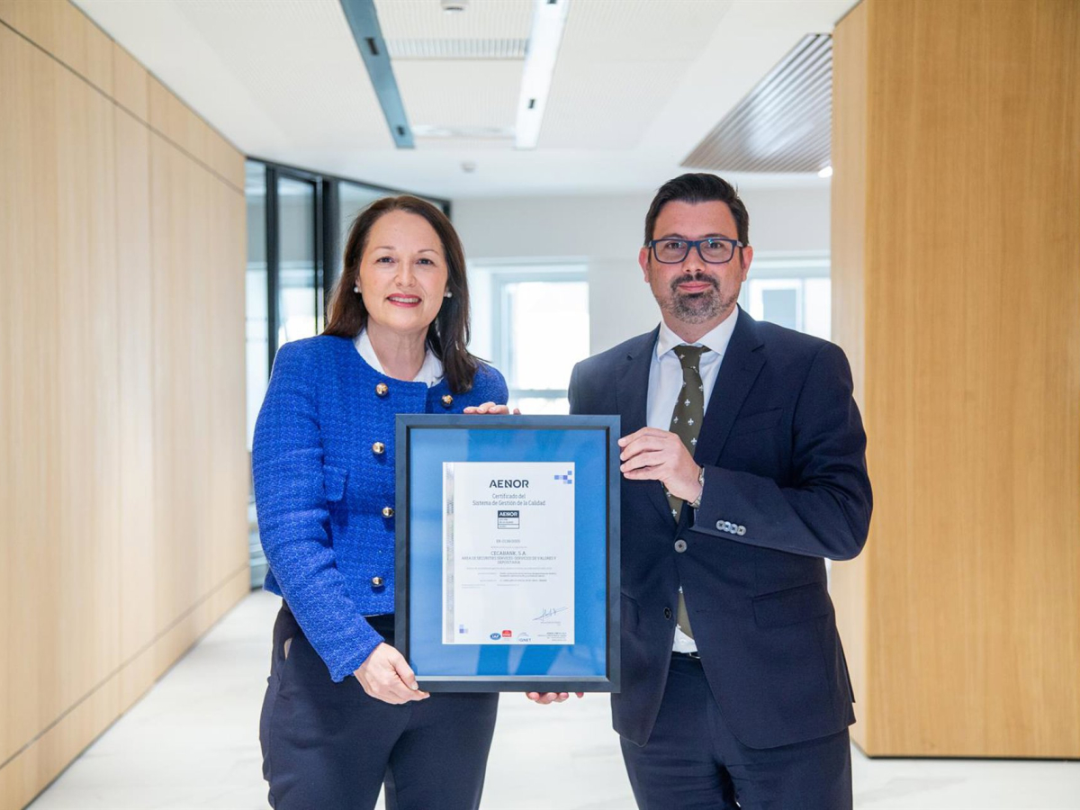 Cecabank ha vuelto a obtener la certificación de Aenor para su sistema de gestión de los Servicios de Depositaría de Fondos y de Custodia y Liquidación de Valores conforme a la norma ISO 9001, un sello de calidad que conserva sin interrupción desde 2005.