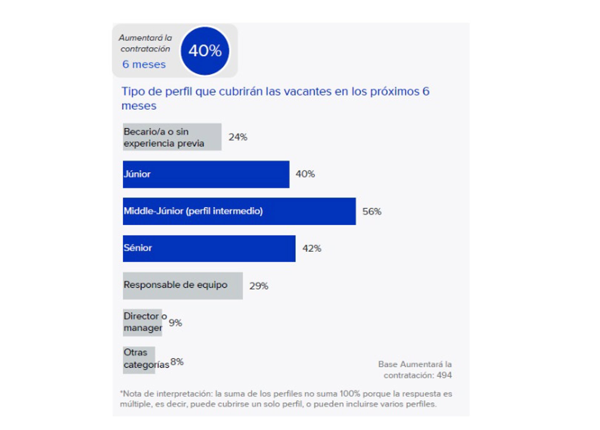 Entre las compañías que planean contratar en los próximos seis meses, se observa que la capacidad de gestión y la trayectoria previa de los perfiles intermedios son especialmente apreciadas, ya que sobre ellos recae la mayor parte de la intención de incorporación. De hecho, el 56% ha señalado que cubrirá puestos de este nivel.