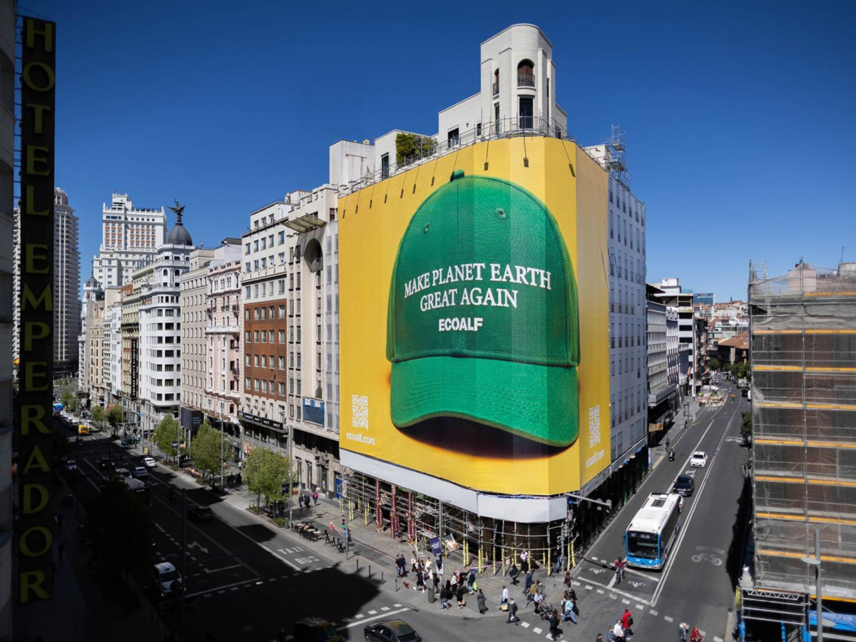 Ecoalf lanza la campaña Make Planet Earth Great Again con una lona en Gran Vía y productos circulares para reforzar su mensaje ambiental global.