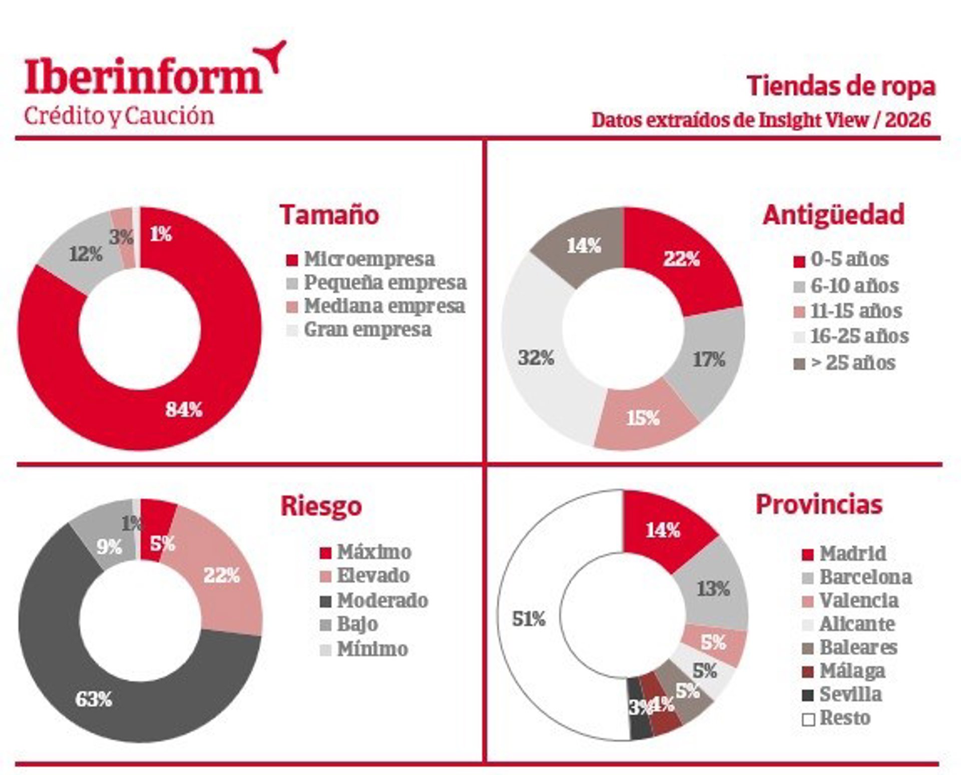 El 27% de los comercios de ropa en España se encuentra en una situación de riesgo máximo o elevado de impago, un leve deterioro frente a los registros de 2025, de acuerdo con los datos de Insight View, la plataforma de bases de datos de Iberinform.