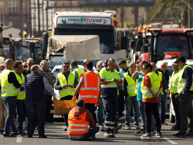 Imagen de una de las tractoradas convocadas por las organizaciones Asaja, UPA y COAG en defensa del sector agrícola en la Región. Reparto de productos agrarios frente a la delegación del Gobierno. EDU BOTELLA/EUROPA PRESS